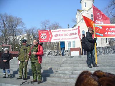 Взявший слово на митинге первый секретарь ЦК ЛКСМ, депутат Законодательного Собрания Приморья Анатолий Долгачёв рассказал собравшимся о своей командировке в Новороссию, где в Краснодоне комсомольцы, как и в годы Великой Отечественной войны, вынуждены действовать в подполье и выявлять украинских диверсантов.