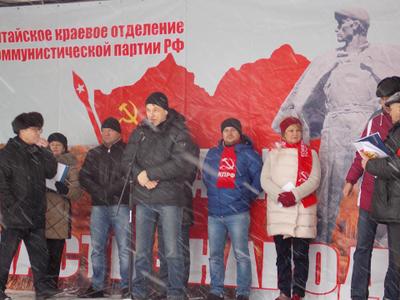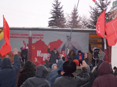 На нашем митинге мы: 1. Требуем от администрации края отменить принятые решения о резком увеличении тарифов на услуги ЖКХ, а ответственных чиновников отправить в отставку. Кризис он для всех и не надо отбирать нищенские крохи у людей. 2. В Барнауле отказаться от их услуг Сибирской генерирующей компании и Водоканала и немедленно организовать их независимую аудиторскую проверку. Наша акция призвана одернуть власть и сказать ей, что пружина народного возмущения не может сжиматься бесконечно. Когда она разожмется, она сметет всех угнетателей – от «хозяев» и директоров до олигархов. Коммунисты будут и дальше продолжать акции протеста и мы приглашаем всех вас принять в них участие.