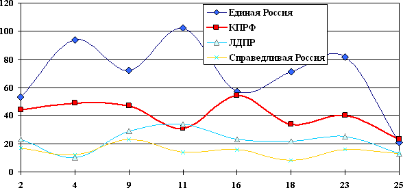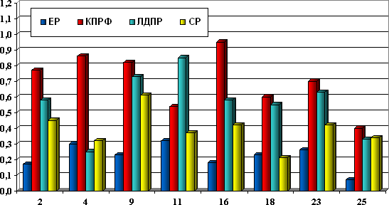 | ЛДПР | 0,58 | 0,25 | 0,73 | 0,85 | 0,58 | 0,55 | 0,63 | 0,33 | 3,53 | 30 |