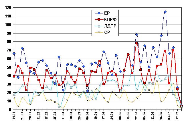 В 60% заседаний в течение весенней сессии показатель активности фракции КПРФ для других депутатских объединений был не досягаем. Наблюдается подъем активности от представителей ЛДПР: им удавалось выйти вперед на каждом третьем заседании, в остальных случаях были вторыми. Депутаты от СР, как правило, были на третьей позиции. И, наконец, по итогам весенней сессии самый низкий показатель у единороссов.