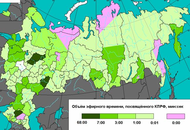 В 50 регионах о деятельности КПРФ упоминалось менее 3 минут за весь месяц. Еще 17 региональных ГТРК освещали ее работу в течение 3-7 минут. Таким образом, в зоне вещания почти 90% российских ГТРК представители Компартии получили в июне, так же как и в мае, меньше времени, чем предоставлялось прежде в обязательном порядке для отчёта одного депутата Госдумы.