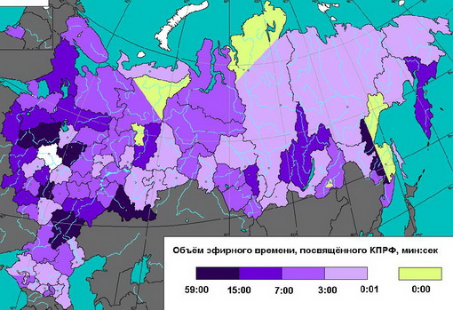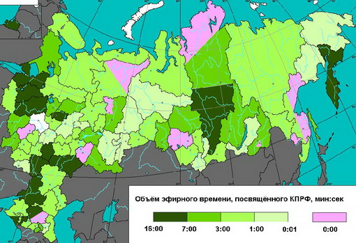 На фоне существенного, в полтора раза, увеличения предоставленного ей эфирного времени в регионах-лидерах также значительно (на 9) увеличилось и число регионов, где КПРФ получила менее 7 минут телевизионного эфира.