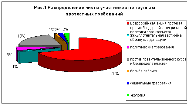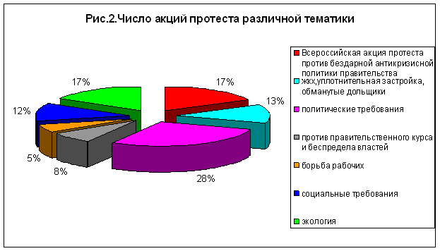 К концу месяца протестная активность резко возросла, главным образом, за счет проведенной КПРФ Всероссийской акции протеста против бездарной политики правительства Путина по выводу страны из кризиса, против безработицы и роста тарифов ЖКХ. В ней приняло участие около 40 тысяч человек, или 70% всех протестующих (рис. 1).