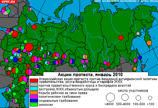 В январе 2010 года было зафиксировано 133 различных акций протеста, в которых приняло участие около 60 тысяч человек. Таким образом, длительные январские выходные почти никак не отразились на протестной активности населения – в январе в тех или иных протестных мероприятиях приняло участие в 3 раз больше человек, чем в декабре.