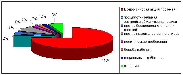 Как и в предыдущие месяцы, основной движущей силой протестного движения была КПРФ. Так, на март пришелся очередной этап Всероссийской акции протеста против бездарной политики правительства по выводу страны из кризиса. Поэтому неудивительно, что основную массу протестующих собрали митинги и пикеты, прошедшие в рамках этой акции (более 140 тысяч человек) (рис.1). Кроме того, почти половина всех акций протеста пришлась именно на акции этой тематики. Эта общероссийская акция стала логическим продолжением масштабных акций против роста цен и тарифов ЖКХ прошлых месяцев, прокатившихся по всей стране.