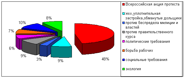 Таким образом, на первый план в направлениях протестного движения выходят борьба с ростом тарифов коммунальных услуг и недовольство социально-экономическим курсом правительства, борьба с произволом правоохранительных органов и чиновников. В последнее время акции протеста с этими требованиями немного отодвинули акции рабочей и социальной тематики.