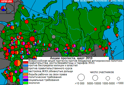 За март 2010 года по сообщениям СМИ в России было проведено 234 акции протеста различной тематики. Протестные настроения в общей сложности затронули 74 региона страны. А всего в протестном движении в марте приняло участие около 190 тысяч человек, что почти в 1,5 раза больше, чем в феврале.