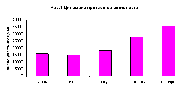 В октябре 2009 года было зафиксировано 200 митингов, пикетов, забастовок и других форм проявления народного протеста. Суммарно в этих акциях приняло участие более 35 тысяч человек, что отражает общую тенденцию роста протестной активности, наметившуюся в последние месяцы (рис.1).