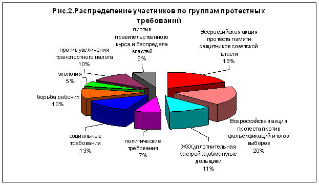 Наиболее крупными акциями месяца стали 2 Всероссийские акции протеста, посвященные памяти защитников советской власти и отмене сфальсифицированных результатов прошедших 11 октября выборов. Обе акции были организованы Коммунистической партией. В них приняло участие более 13 тысяч человек, т.е. около 38% всех протестующих (рис.2).