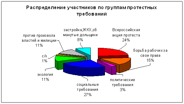 А по числу жителей, принявших участие в акциях протеста, первые позиции занимают Московская, Владимирская, Самарская и Омская области, Санкт-Петербург, республика Удмуртия и Алтайский край. В этих регионах протестовало около 11 тысяч человек. Однако безусловным лидером по-прежнему остается Москва. Здесь в различных формах народного волеизъявления приняло участие более 4 тысяч человек.