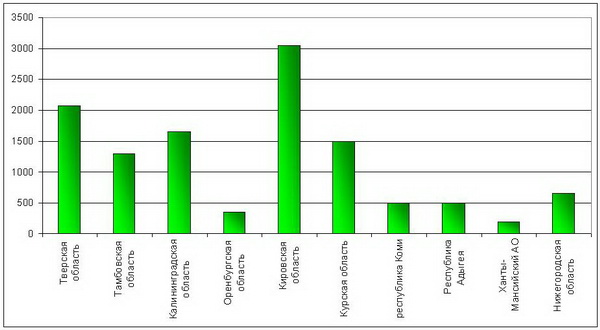 Наибольшее число участников собрали акции протеста Кировской области (более 3 тысяч человек). В лидеры также входят Тверская (2 тысячи участников), Калининградская (1,6 тысяч), Курская (1,5 тысячи) и Тамбовская (1,3 тысячи) области. Минимальное число участников акций было отмечено в Оренбургской области (300 человек) и Ханты-Мансийском автономном округе (200 человек) (рис.1).