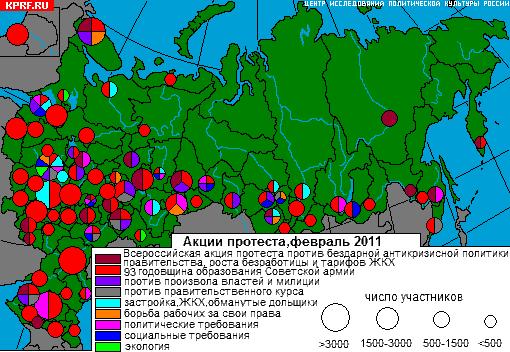 Всего за февраль 2011 года было зафиксировано около 300 митингов, пикетов и других форм проявления народного недовольства. Общая численность участников составила около 100 тысяч человек, что превышает показатели января в 2 раза. Значительно увеличилось и число регионов, вовлеченных в протестную активность – с 64 до 75.