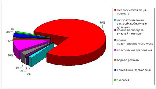 - Наибольшее число участников собрала Всероссийская акция протеста против бездарной политики правительства по выводу страны из кризиса, против безработицы и роста тарифов ЖКХ. В ней приняло участие около 35 тысяч человек, или 80% всех протестующих.