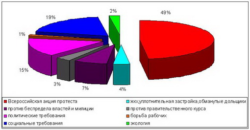 В общем числе акций протеста также лидируют акции в рамках Всероссийской (49% всех акций, проведенных в январе), далее следуют акции с социальными и политическими требованиями, выступления против произвола властей и милиции, а также акции против уплотнительной застройки (рис.2).