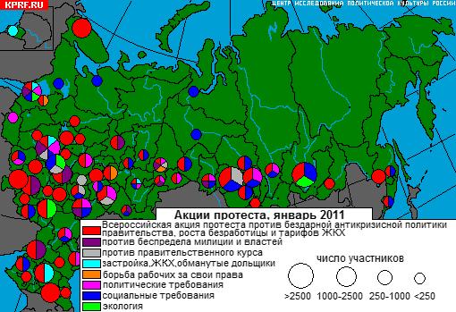 В январе 2011 года было зафиксировано более 200 различных акций протеста, в которых приняло участие около 45 тысяч человек. На уровень протестной активности повлияли длительные январские выходные - в январе в тех или иных протестных мероприятиях приняло участие в 2 раза меньше человек, чем в декабре. Незначительно сократилась и география протестных действий. Так, в целом в январе те или иные акции протеста охватили 64 региона России (в прошлом месяце около 70).