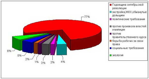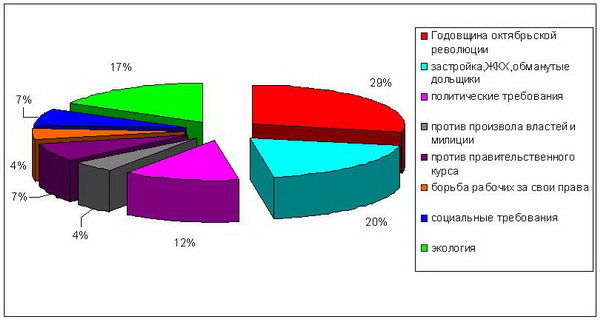 В результате, главными направлениями протестного движения месяца стали празднование годовщины Октябрьской революции (77% участников и 29% от числа всех акций месяца), борьба обманутых дольщиков, акции экологической и социальной тематики (рис.1,2). Около 12% всех выступлений было посвящено гражданско-политическим темам (защита журналистов, поддержка социальных активистов и защитников Химкинского леса и др.).