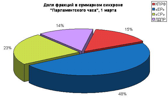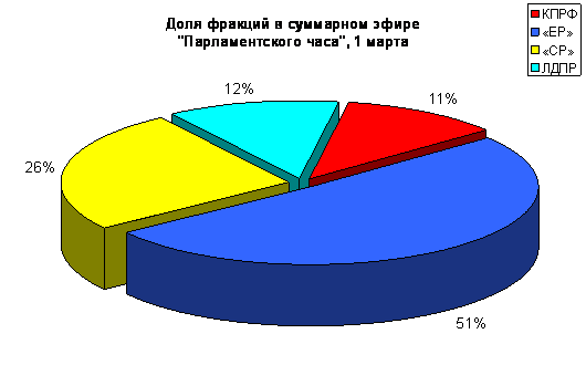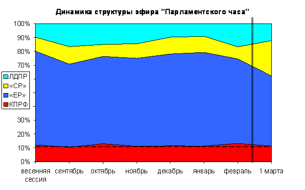 Доля эфира, предоставленного передачей «Парламентский час» каждой из фракций, менялась с марта 2008 г. по март 2009 г. следующим образом (График 3):