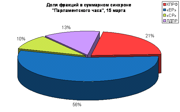 15 марта в «Парламентском часе» вышло всего 10 телесюжетов (Таблица 1). Из них 4 было посвящено только депутатам фракции «Единая Россия».