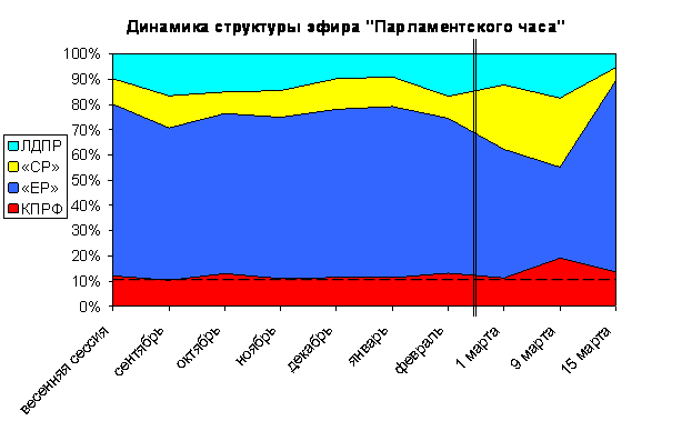 Доля эфира, предоставленного передачей «Парламентский час» каждой из фракций, менялась с марта 2008 г. по март 2009 г. следующим образом (График 3):