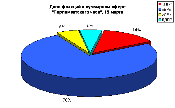 15 марта 2009 года в передаче «Парламентский час» на телеканале «Россия» фракции КПРФ было посвящено 4 минуты 15 секунд, или 14%. Фракция «Единая Россия» заняла 76% эфира передачи, или 23 мин 38 сек, что в 6 раз больше, чем КПРФ.