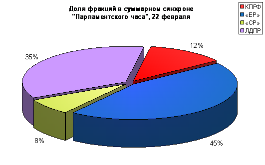 22 февраля в «Парламентском часе» вышло всего 11 телесюжетов (Таблица 1). Из них 2 было посвящено только депутатам фракции «Единая Россия» и один - только ЛДПР.