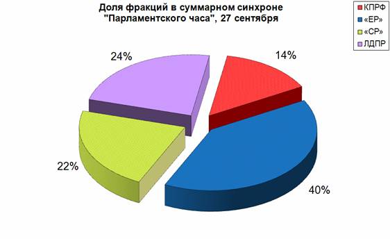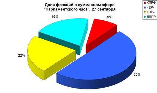 27 сентября в «Парламентском часе» вышло всего 12 телесюжетов (Таблица 1). Из них 3 было посвящено только депутатам фракции «Единая Россия» и по одному депутатам от «СР» и ЛДПР.