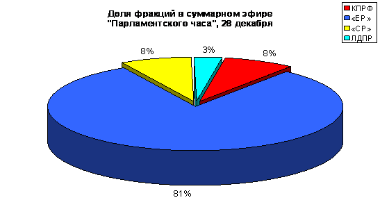 28 декабря в «Парламентском часе» вышло всего 13 телесюжетов (Таблица 1). Из них 7 было посвящено только депутатам фракции «Единая Россия».