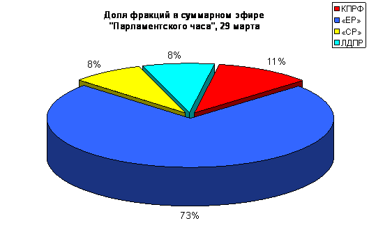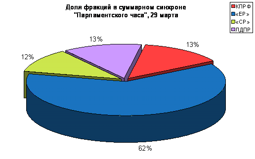 29 марта в «Парламентском часе» вышло всего 9 телесюжетов (Таблица 1). Из них 4 было посвящено только депутатам фракции «Единая Россия» и - только ЛДПР.