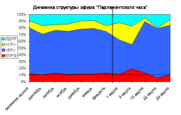 Доля эфира, предоставленного передачей «Парламентский час» каждой из фракций, менялась с марта 2008 г. по март 2009 г. следующим образом (График 3):