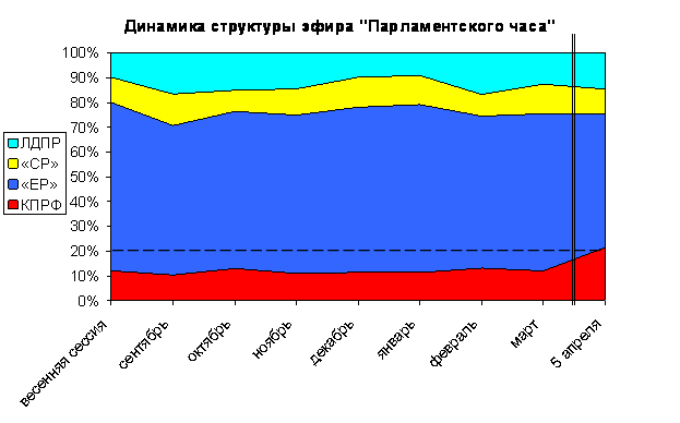 5 апреля 2009 года в передаче «Парламентский час» на телеканале «Россия» фракции КПРФ было посвящено 5 минут 59 секунд или 21%. Фракция «Единая Россия» заняла 54% эфира передачи, или 15 мин 3 сек, что в два с половиной раза больше, чем КПРФ.