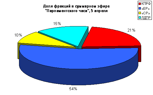 5 апреля в «Парламентском часе» вышло всего 8 телесюжетов (Таблица 1). Из них два было посвящено только депутатам фракции «Единая Россия».