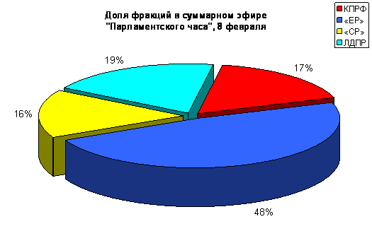 8 февраля 2009 года в передаче «Парламентский час» на телеканале «Россия» фракции КПРФ было посвящено 6 минут 12 секунд, или 17%. Фракция «Единая Россия» заняла 48% эфира передачи, или 17 мин 43 сек, что в 3 раза больше, чем КПРФ. Фракция ЛДПР получила 19% эфира, что на 51 секунду больше, чем Компартия.