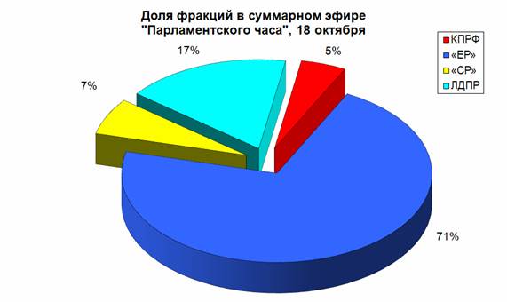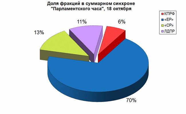 18 октября в «Парламентском часе» вышло всего 11 телесюжетов (Таблица 1). Из них 5 было посвящено только депутатам фракции «Единая Россия» и 1 - ЛДПР.