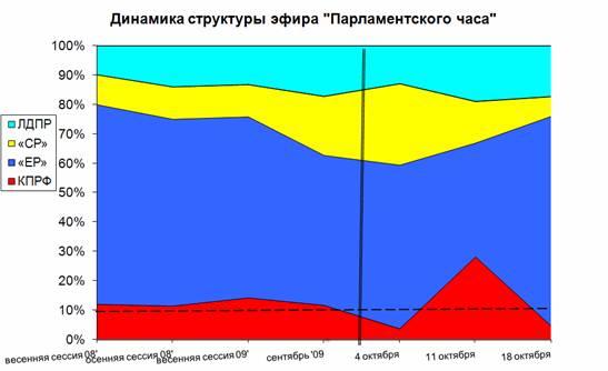 18 октября 2008 года в передаче «Парламентский час» на телеканале «Россия» фракции КПРФ было посвящено 1 минута 36 секунд, или 5%. Фракция «Единая Россия» заняла 71% эфира передачи, или 24 мин 8 сек, что в 15 раз больше, чем КПРФ. Фракция ЛДПР получила 17% эфира, что в 4 раза больше, чем Компартия. «СР» получила 7%, что в полтора раза больше, чем КПРФ.