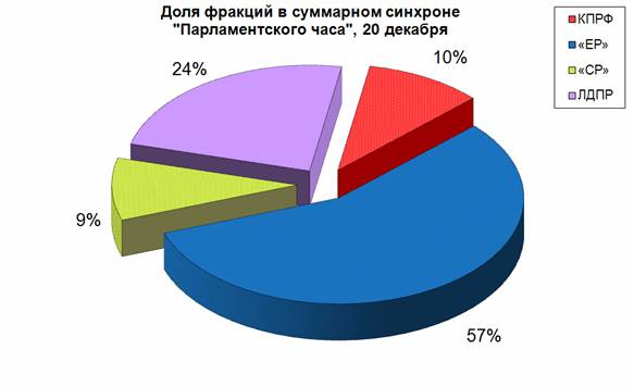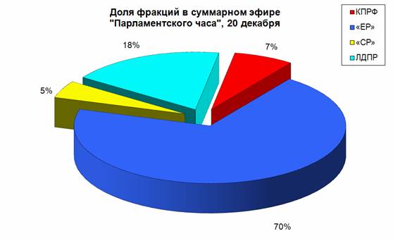 - В «Парламентском часе», вышедшем 20 декабря по сравнению с предыдущей передачей значительно возросла доля ЛДПР (на 6%). Между тем, доля КПРФ увеличилась лишь на 1%.