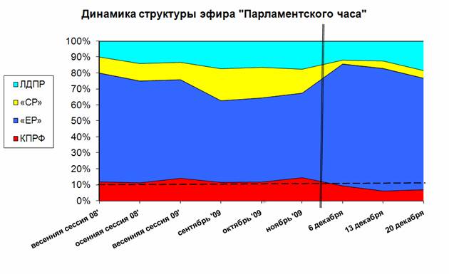 20 декабря 2009 года в передаче «Парламентский час» на телеканале «Россия» фракции КПРФ было посвящено 2 минуты 16 секунд, или 7%. Фракция «Единая Россия» заняла 70% эфира передачи, или 22 мин 4 сек, что в 10 раз больше, чем КПРФ. Фракция ЛДПР получила 18% эфира, что в 3 раза больше, чем Компартия.