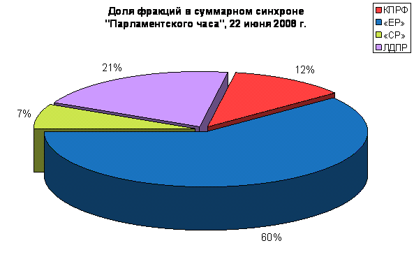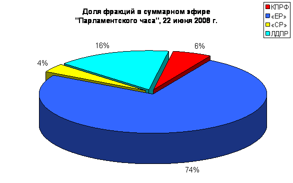 7 июня 2009 года в передаче «Парламентский час» на телеканале «Россия» фракции КПРФ было посвящено 1 минута 27 секунд, или %. Фракция «Единая Россия» заняла % эфира передачи, или 27 мин 36 сек, что в 19 раз больше, чем КПРФ. Фракция ЛДПР получила % эфира, что на 9 секунд больше, чем Компартия.