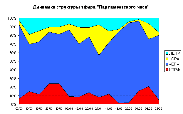 Доля эфира, предоставленного передачей «Парламентский час» каждой из фракций, менялась с марта 2008 года по июнь 2009 года следующим образом (График 3):