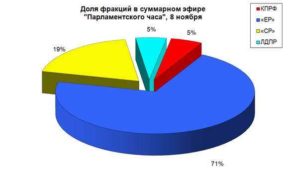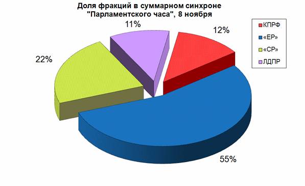 График 3 показывает, что доля коммунистов в передаче «Парламентский час» 8 ноября существенно упала по сравнению с передачей, выходившей 1 ноября.