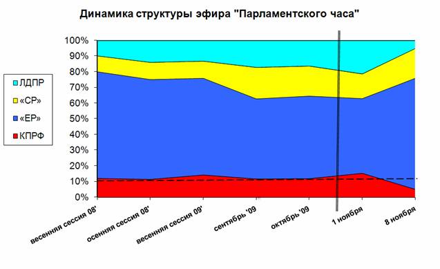 8 ноября 2008 года в передаче «Парламентский час» на телеканале «Россия» фракции КПРФ было посвящено 1 минута 40 секунд, или 5%. Фракция «Единая Россия» заняла 71% эфира передачи, или 22 мин 57 сек, что в 14 раз больше, чем КПРФ. Фракция «СР» получила 19% эфира, что в 4 раза больше, чем Компартия.