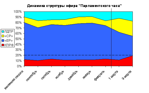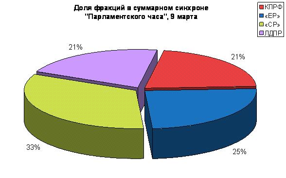 Доля эфира, предоставленного передачей «Парламентский час» каждой из фракций, менялась с марта 2008 г. по 9 марта 2009 г. следующим образом (График 3):