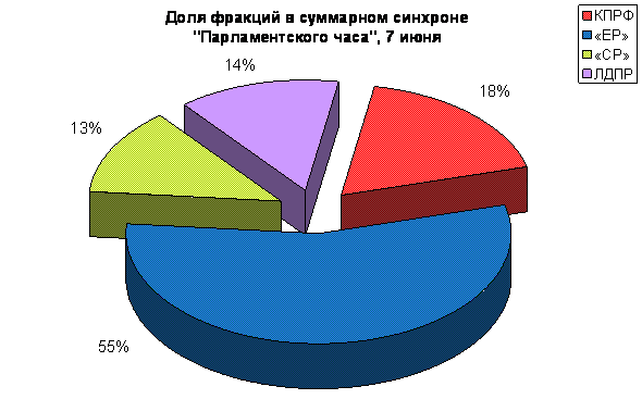 14 июня 2009 года в передаче «Парламентский час» на телеканале «Россия» фракции КПРФ было посвящено 7 минут 40 секунд, или 26%. Фракция «Единая Россия» заняла 60% эфира передачи, или 17 мин 38 сек, что в два раза больше, чем КПРФ.