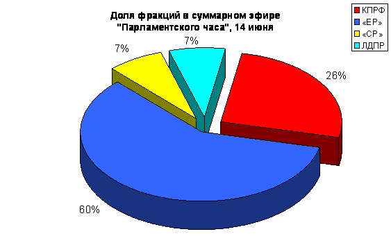 · В передаче «Парламентского часа» от 14 июня существенно увеличилась доля КПРФ по сравнению с передачей, выходившей 7 июня. Данное увеличение вызвано прошедшим в Госдуме Круглым столом на тему поддержки семьи, детей и материнства, организованного Коммунистами.