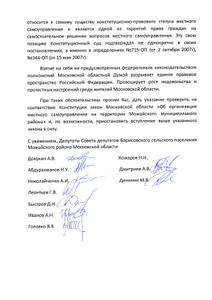 В связи с этим, депутаты Совета депутатов с.п. Борисовское обратились к Президенту РФ Путину с просьбой проверить на соответствие Конституции закон Московской области «Об организации местного самоуправления на территории Можайского муниципального района» и остановить вступление выше указанного закона в силу.