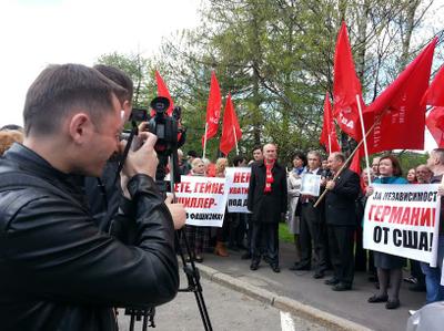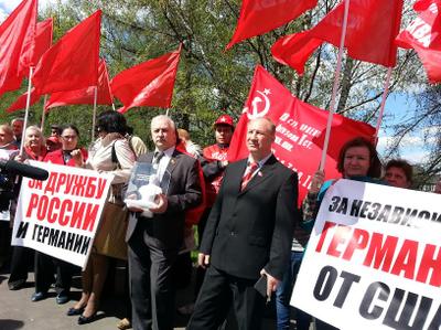 5 мая депутаты Государственной Думы Валерий Рашкин, Владимир Родин и Александр Потапов, депутат Московской городской думы Николай Зубрилин, а также сторонники и активисты партии вручили сотрудникам посольства Германии в Москве небольшой бюст освободителя Европы от фашизма И.В. Сталина и копию Знамени Победы.