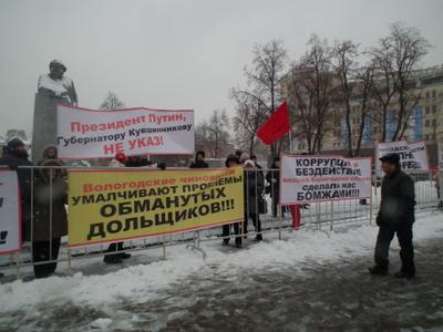 Перед собравшимися выступил депутат фракции КПРФ Государственной Думы ФС РФ Е.В. Доровин. Он рассказал о том, что делают депутаты-коммунисты Мосгордумы, защищая интересы обманутых дольщиков Москвы и Подмосковья, как помогают им отстаивать законные права в судах различных инстанций. Он сообщил, что уже оказана юридическая помощь более 500 обратившимся. И это было успешно сделано, несмотря на то, что депутатов-коммунистов в Мосгордуме всего трое на 32 депутата-«единоросса». Он посоветовал обманутым дольщикам из Вологодской области шире использовать возможности депутатов регионального парламента, местного самоуправления. Одновременно Е.В. Доровин заверил собравшихся, что со своей стороны депутаты фракции КПРФ в Государственной Думе будут всемерно помогать обманутым дольщикам добиваться справедливого решения их проблем.