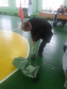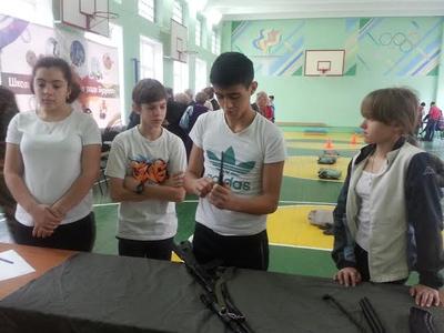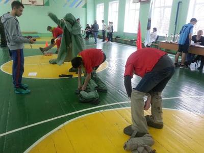 Школьники отвечали на вопросы викторины, состязались в сборке-разборке автомата, надевании противогазов и костюмов химзащиты на скорость, умении оказывать первую помощь, строевой подготовке и других упражнениях.