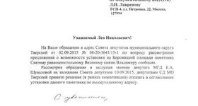 14 сентября в Московскую городскую Думу направлено обращение Совета депутатов муниципального округа Тверской, в котором сообщается о принятом 10 сентября решении отказать в согласовании установки памятника князю Владимиру на Боровицкой площади.