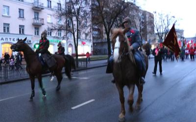 Но впереди многочисленной колонны по традиции шли конники, затем военные несли бархатное знамя партии.