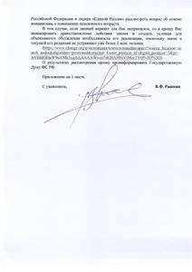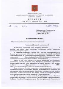 Вместе с тем, чтобы его заявление о том, что население пенсионную «реформу» правительства не поддерживает, не выглядело голословным В.Ф. Рашкин приложил к своему депутатскому запросу одно из обращений, поступающих на его электронную почту, с просьбой принять меры, чтобы власти остановили закон о повышении пенсионного возраста.